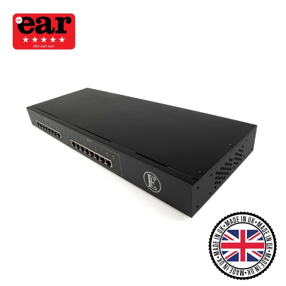 The English Electric 16Switch is a high-performance, two-zone, dual power supply, 16-port Gigabit Ethernet (GbE) device, meticulously optimised for music and video streaming. Building on the success of the EE 8Switch, the 16Switch is designed for larger networks, featuring two independent rows of eight premium Gigabit Ethernet ports. These can function either as two separate eight-way switches or be combined into a single 16-way device.