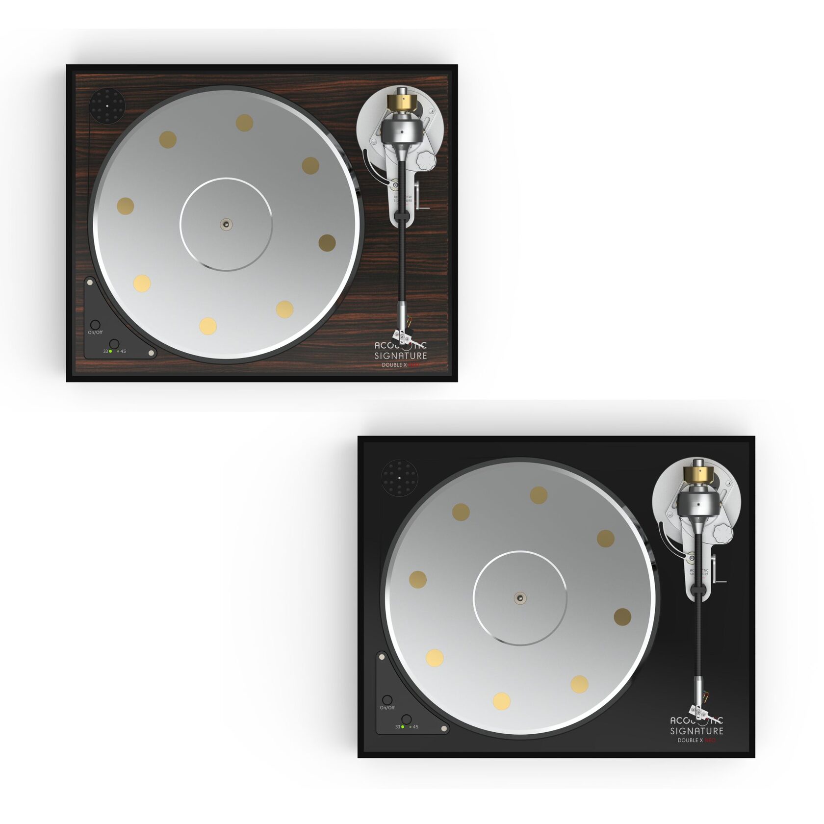 Acoustic Signature Double X NEO on suurejooneline plaadimängija, mis on rõõmustanud paljude analoogiarmastajate südameid kogu maailmas. Oma elegantse välimusega esindas see algselt ülimoodsa tehnoloogia ja klassikalise disaini täiuslikku sünteesi. Järelikult tõstab see uuendatud mudel jõudluse enneolematutesse helikõrgustesse, mida ükski selles hinnaklassis olev suure massiga (high-mass) plaadimängija pole kunagi saavutanud.
