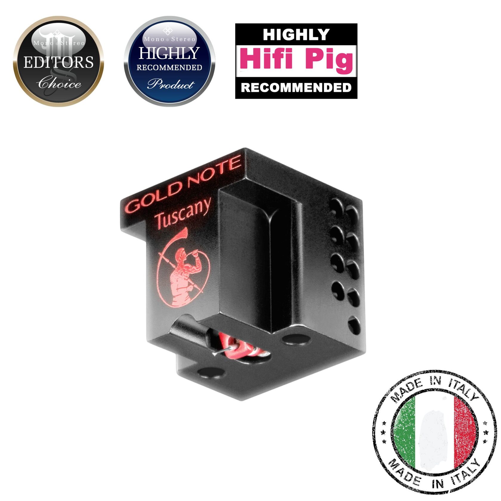 The gold-plated long connectors ensure optimal contact with the tonearm’s cinch, preserving the signal and enhancing grounding to faithfully reproduce every musical nuance. Available in two models—Gold and Red—Tuscany cartridges boast precious coils made from silver and copper, respectively.